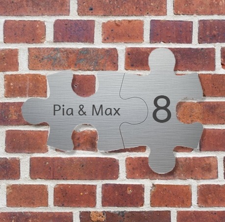 Ein besonderes Puzzleteil Türschild in Edelstahl-Optik. Dieses Türschild wird ganz auf Wunsch für Sie gefertigt und jedes Familienmitglied hat seinen eigenen Platz. Inklusive einer unsichtbaren Befestigung mit Schrauben und Abstandshalter.